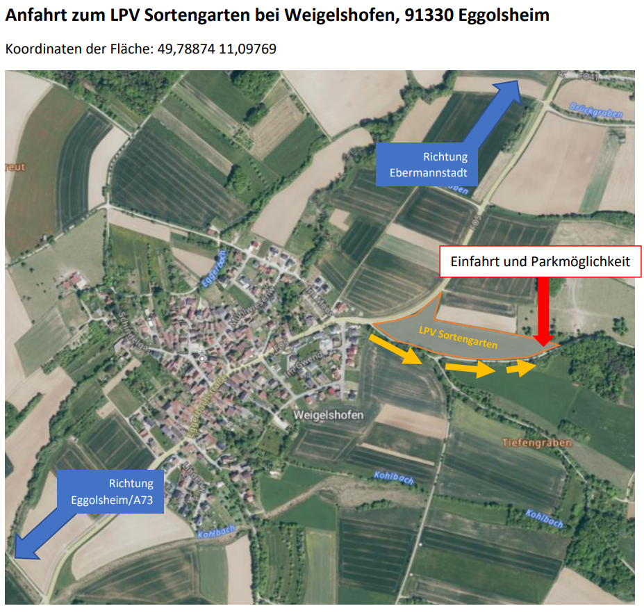 Zusätzlich wurde im Jahr 2020 im Weigelshofen ein neuer 2 ha großer Sortengarten angelegt. Dieser Garten dient nicht nur der Erhaltung häufiger, an die lokale Umgebung angepasster Apfel- und Birnensorten, sondern beherbergt auch zahlreiche regionaltypische Sorten, die das Erbe und die Vielfalt der Obstbaukultur im Landkreis bewahren sollen. Der Sortengarten ist jederzeit frei zugänglich, Besucher können sich so in Natura ein Bild von Baum und Frucht machen und über die QR-Codes an jedem Baum detaillierte Infos zu allen Sorten abrufen. Eine Anfahrtsbeschreibung finden Sie